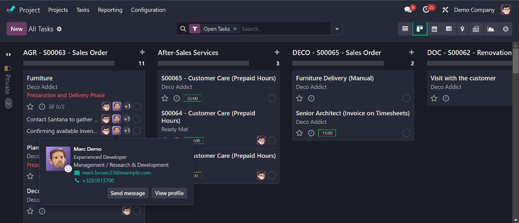 The latest Odoo version introduced the avatar card preview when clicking the user's picture. Directly in the Project's Kanban view, you can see task assignees' information card, which shows their position, email, department, and phone number, and the options to chat and view their full profile. This new feature is also available across Odoo modules.