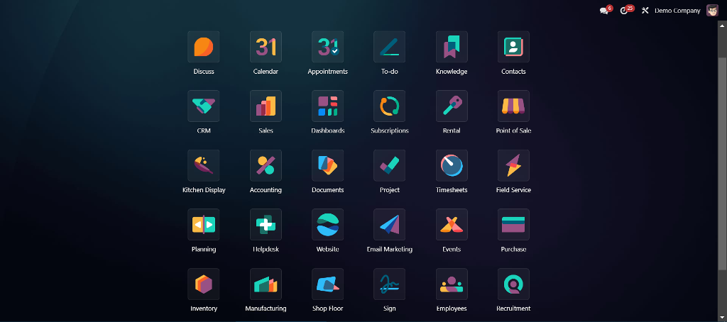 The dominance of achromatic colors for the main menu and icons amplifies the new Odoo refined look. Not only does it improve elegance, but it also magnifies the readability of each module.