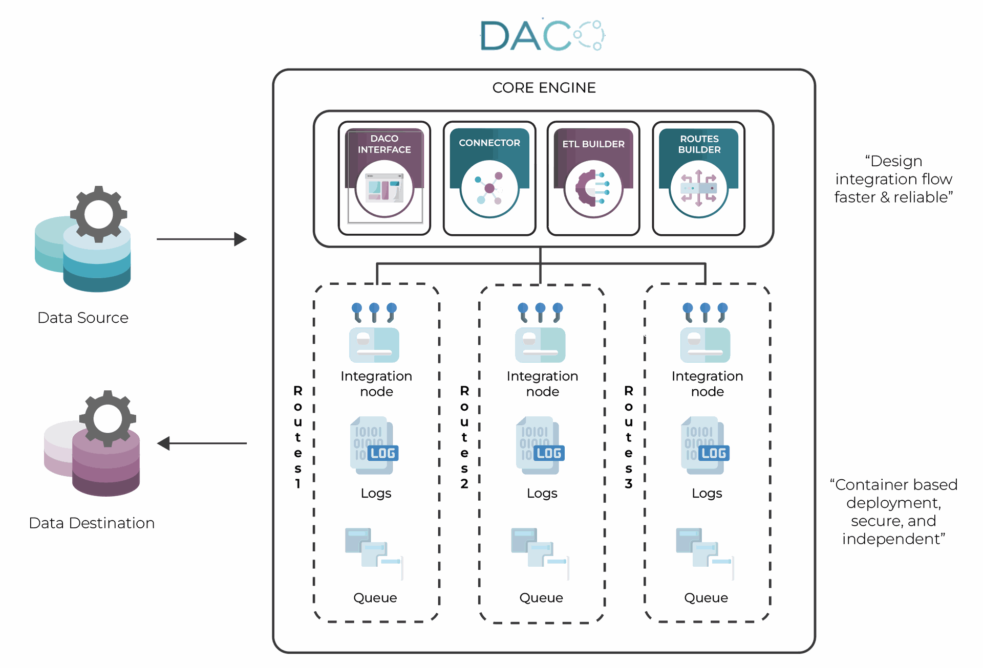 • Centralized Control and Management: DACO takes control, managing all data flows, routes, triggers, and events from a single, unified platform. This centralized approach provides complete visibility and control over all integration processes.